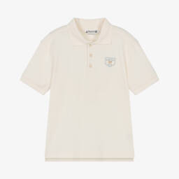 A classic ivory polo shirt for boys by luxury French brand, Bonpoint. Combining timeless styling with everyday comfort, it is made in soft organic cotton piqué with a traditional collar and button placket. The embroidered branding on the chest adds a hint of contrast and elevated touch.