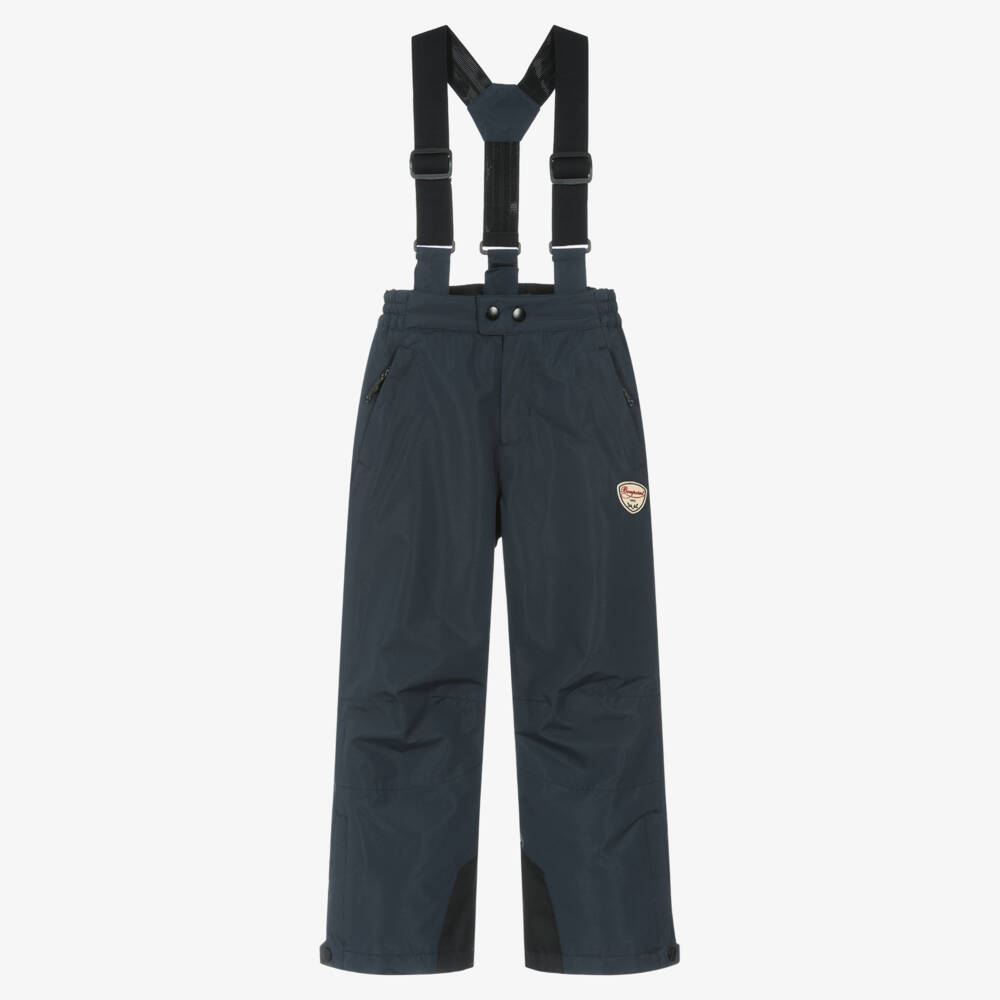 Navy blue ski trousers for boys by Bonpoint, made in a silky smooth fabric. These technical trousers are padded for warmth and have easily removable, stretchy and adjustable shoulder straps. The waistband is elasticated on the sides for comfort, with a popper and zip fastening on the front. There are useful zipped pockets and internal elasticated gaiters to prevent snow from entering, along with scuff guards on the ankles for durability. A logo patch on the front adds a distinctive designer finish.