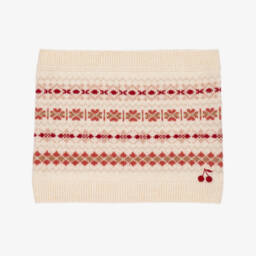 Beige snood for girls by luxury French brand Bonpoint, knitted in the finest Merino wool. Warm and cosy, it features the brand's iconic cherry motifs, a blue and ivory Fair Isle pattern and it has ribbed trims.