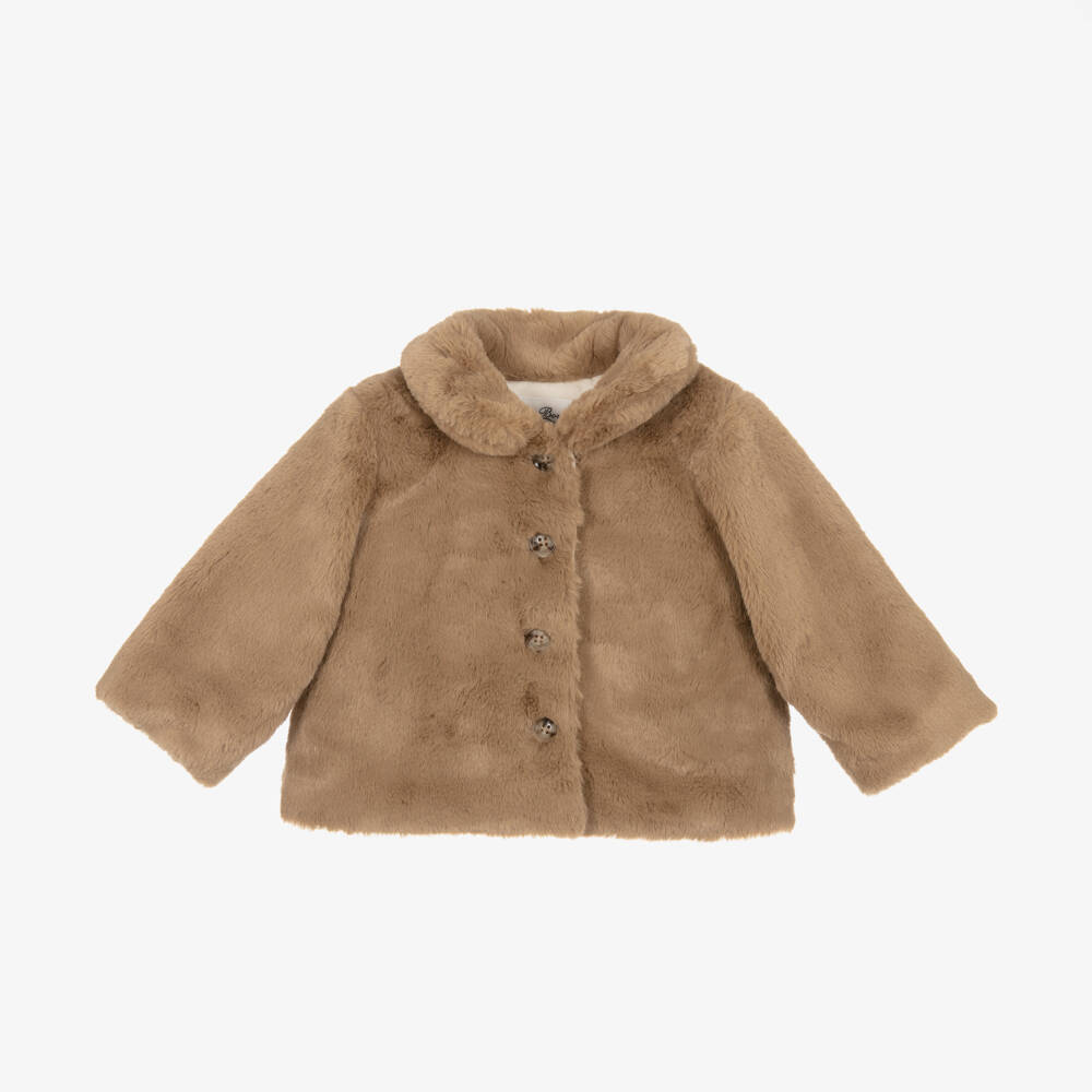 A charming brown faux fur coat for little girls, designed by luxury French brand Bonpoint. This timeless piece has a Peter Pan collar with tortoiseshell buttons fastening beneath. Lightly padded for warmth, this cosy coat has a beautifully soft brushed cotton lining for comfort.
