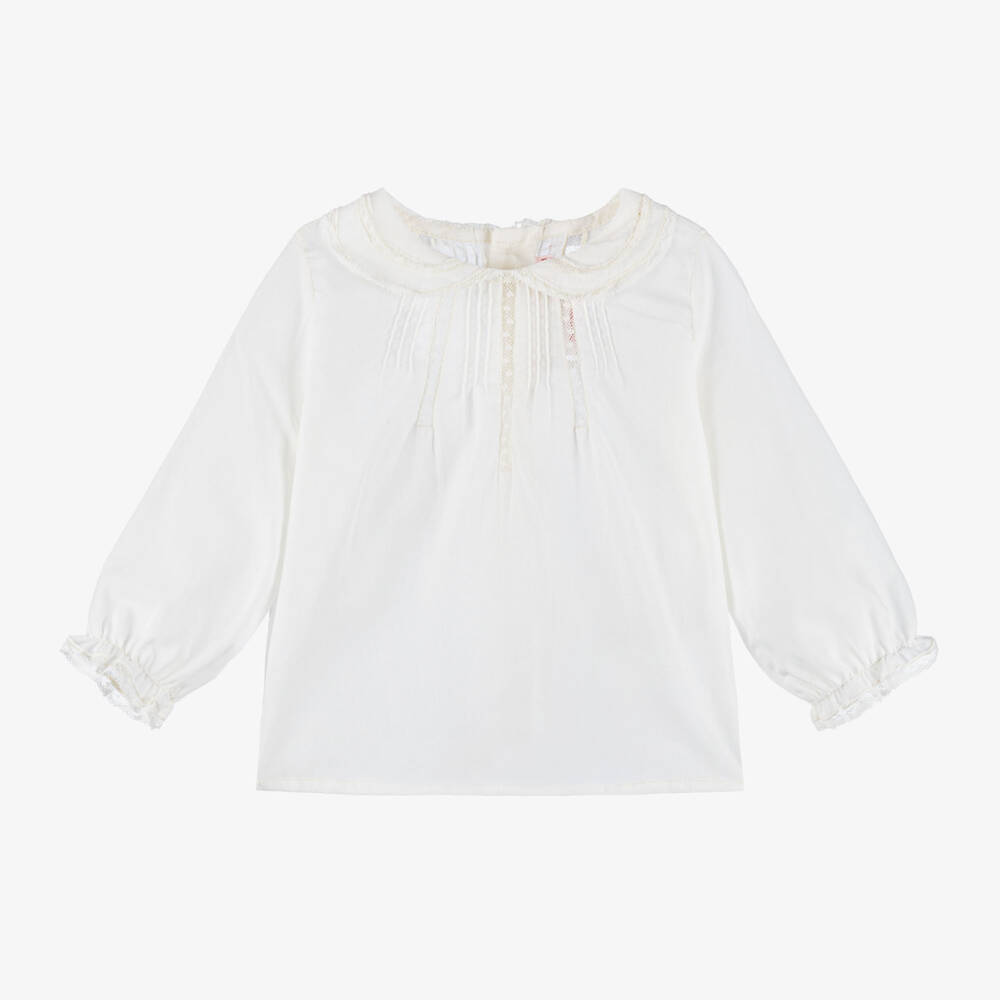 بلوز قطن مزين بدانتيل لون عاجي للبنات