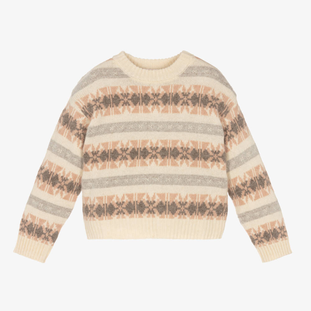 Ivory wool and cashmere blend sweater for girls by classic French brand Bonpoint. Super soft and cosy, it is patterned in snowflake-style stripes in pink and grey, with glittery grey stripes between. It has neat ribbed trims for extra warmth.