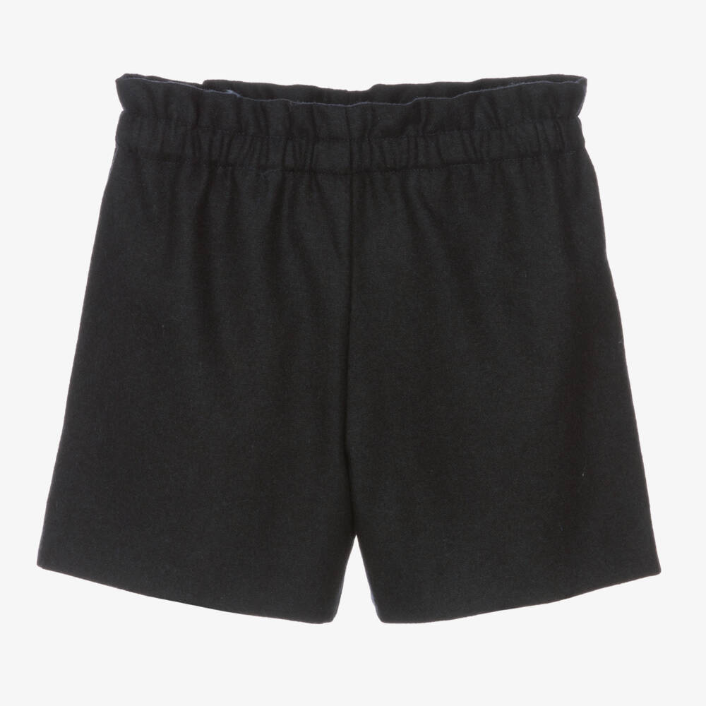 Navy blue shorts for girls by Bonpoint, made in a soft wool blend. Easy to slip on, this timeless style has a straight leg cut and ruffles on the elasticated waist. They have two patch pockets on the back and a silky smooth lining for added comfort.