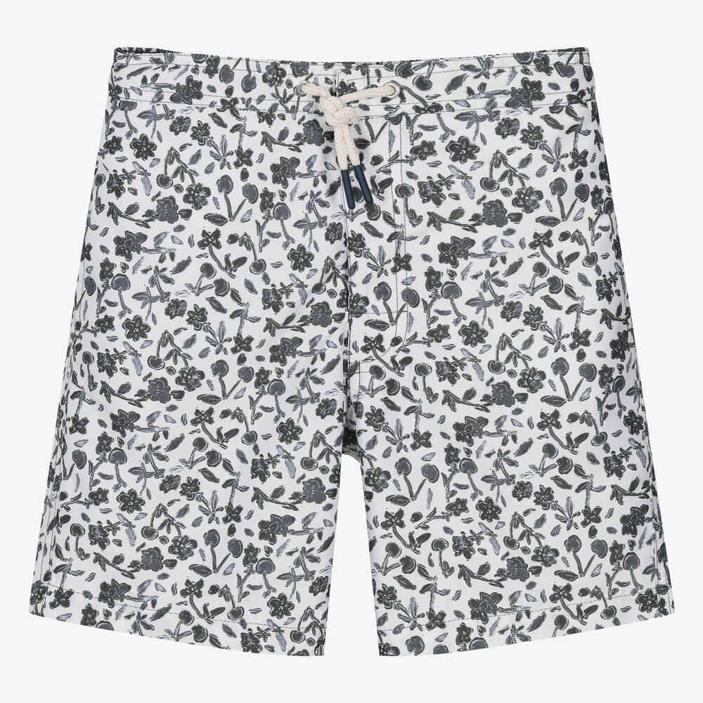 From luxury French brand Bonpoint, a pair of ivory and black swim shorts for teen boys. They have a cool floral print featuring the label's signature cherry motif, with a tonal logo print on the back pocket for a discreet designer touch. They fasten with easy poppers and have an elasticated waistband with an adjustable drawstring for a great fit. Made in silky fabric with a comfortable mesh lining, they have practical side seam pockets and a patch pocket on the back.