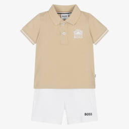 A charming beige and white cotton dungaree set for baby boys by BOSS, presented in a lovely gift box. Made in mid-weight piqué and partly lined for comfort, the dungaree has a white Double B monogram embroidery on the patch pocket and branded poppers. A white T-shirt with matching beige stripes completes the set.
