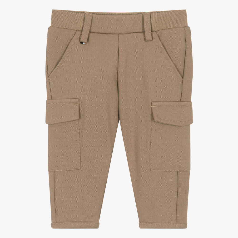 Beige cargo trousers for baby boys by German brand BOSS, with a grosgrain logo trim on one of the front belt loops in the label's signature colours of black, white and beige. Super soft and comfortable, they are made in viscose-blend jersey and have an elasticated waistband. They have cargo-style flap pockets and are easy to wear, simply pulling up.