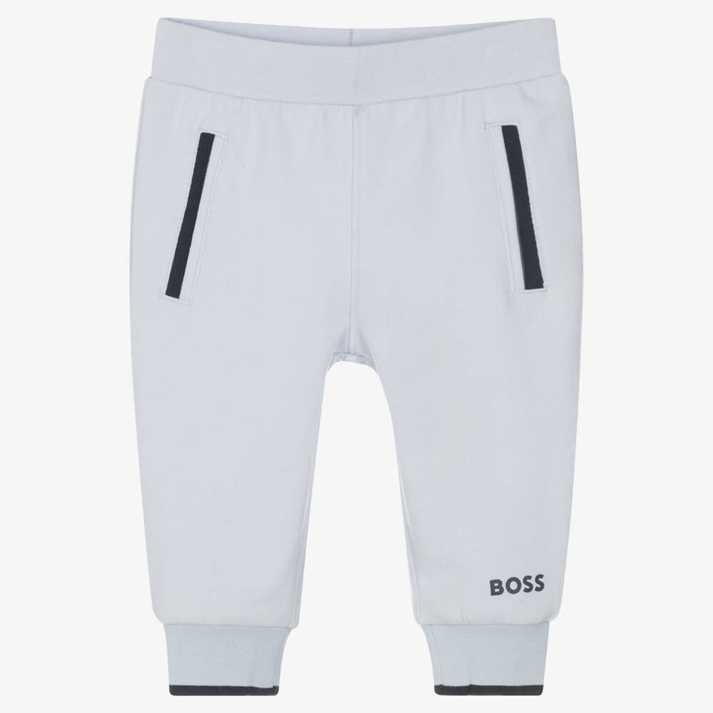Pale blue joggers for baby boys by BOSS, with navy blue trims. The front has faux pocket detailing and is printed with the brand's logo name for a signature look. Soft and comfy, these sporty trousers are made in cotton jersey and have a gently elasticated waistband. This garment is made from a minimum of 60% organic cotton, for a reduced impact on the planet.