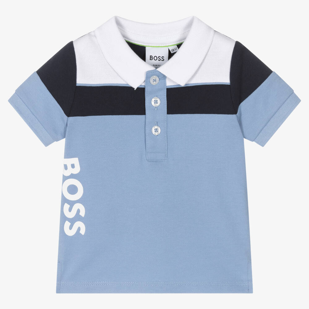 Blue cotton piqué polo shirt for baby boys from BOSS. This piece is traditionally styled with a collar and button fastenings on the front, with navy blue and white panels across the shoulders. A large white logo print on one side gives it a distinctive designer finish.
