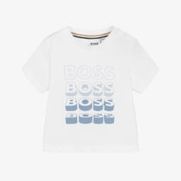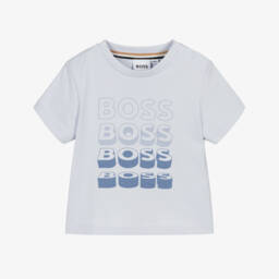 تيشيرت لون أزرق فاتح بأكمام قصيرة للأولاد الرضع من ماركة بوس، مصنوع من قطن جيرسي ناعم. يتميز هذا التيشيرت الكاجوال بتصميم شعار مكرر مطبوع على الجهة الأمامية بتدرجات اللون الأزرق، ويغلق بأزرار كبس تحمل شعار الماركة على الكتف لتسهيل عملية اللبس.
