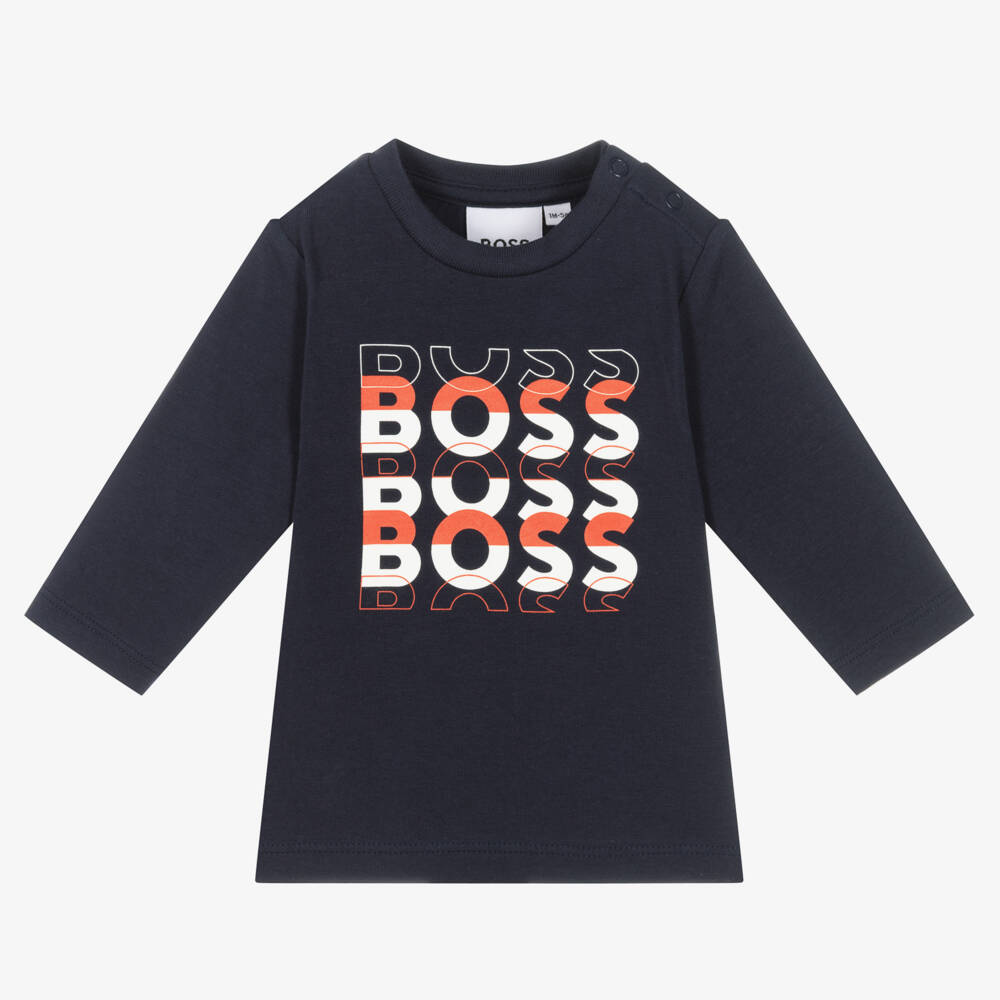Navy blue cotton top for baby boys from BOSS. Made in soft, comfortable jersey, it has an orange and white repeat logo print on the front. There are popper fastenings on one shoulder for speedy dressing. This garment is made from a minimum of 60% organic cotton.