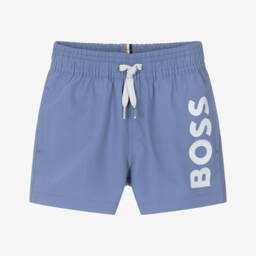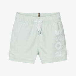 Baby boys pastel green swim shorts by BOSS, with a bold white logo print. Silky smooth and lightweight, they have an elasticated waistband with a faux drawstring detail. There are useful side seam pockets, and tricolour striped trim on the back, adding a signature finish.