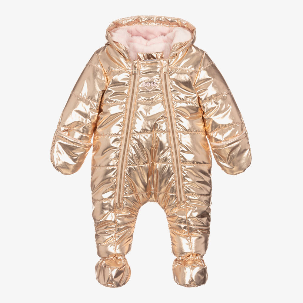 Keep your little one warm and cosy in this metallic rose gold snowsuit for baby girls, by BOSS. Lined in soft and snuggly plush faux fur, this snowsuit has a pink heart logo print on the front and two zip fastenings. The sleeves have attached fold-over mittens, which can be attached to the sleeve with a popper for a cooler, versatile fit. The legs have adorable tiny booties that can be attached with a popper so they never get lost. The water repellent fabric ensures your baby girl will stay dry on rainy days.