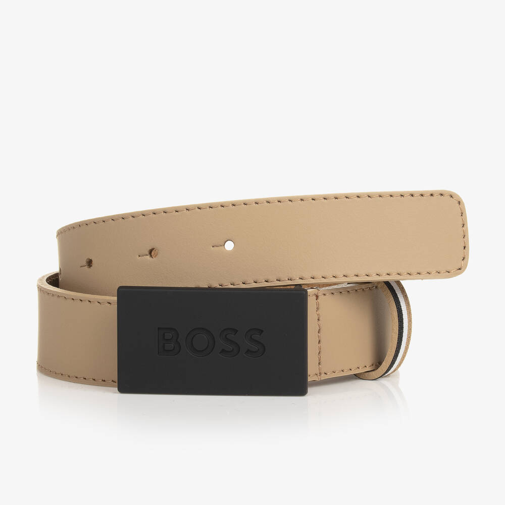 Distinctively BOSS, this beige leather belt for boys has a matte black buckle and signature striped trim. Made in supple leather, it has an adjustable fit and the buckle has an embossed logo to complete the look.