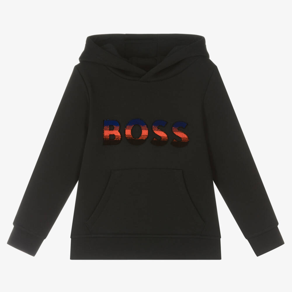 A casual black hoodie for boys by BOSS, made from super soft cotton with a fleecy interior. Great for making a statement, this top has a raised logo design in blue, orange and black. A large kangaroo pocket completes the style.