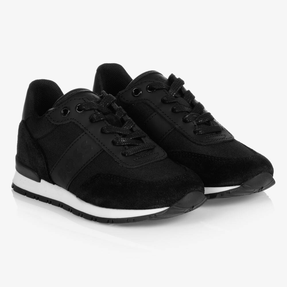 Black retro-style trainers for boys by BOSS with a silver logo printed on the side. Lace-up, they are made in canvas with suede leather trims and white logo-embossed leather trims with light reflective detail on the back. Lined in soft fabric with a lightly padded insole, they have stacked black and white rubber sole.