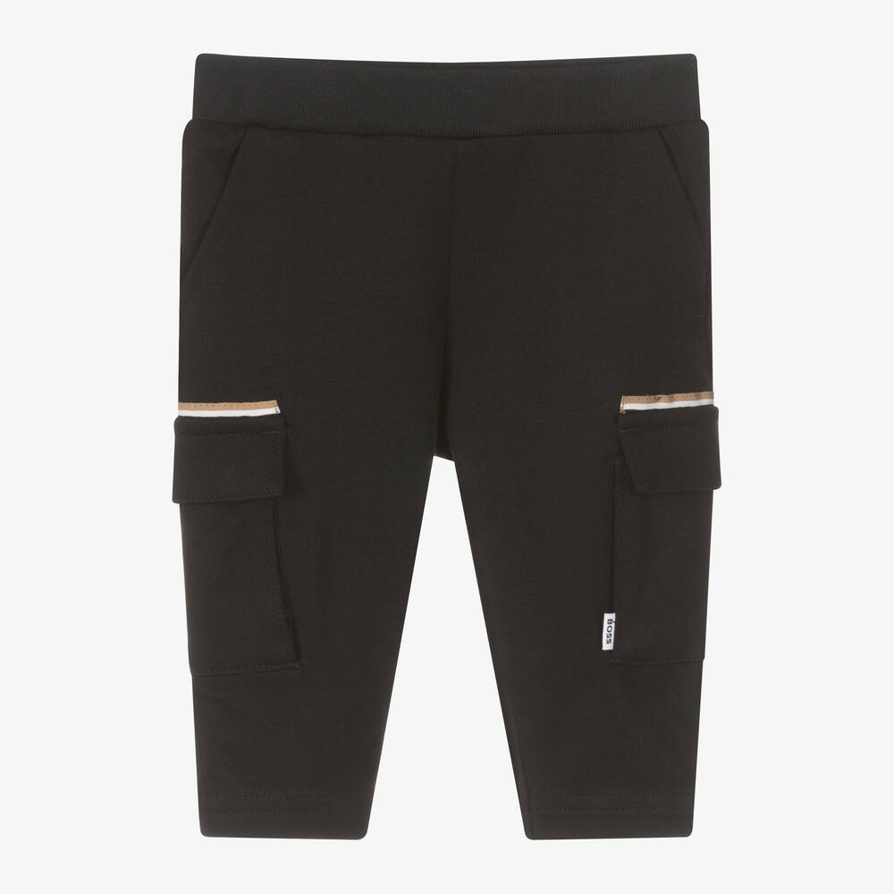 Black viscose trousers for little boys by German brand BOSS, made in soft, comfortable jersey. They have useful, popper-fastening cargo pockets, both trimmed with the label's signature colours of beige, white and black, and one with a logo tab. They have slanted front pockets and a stretchy, elasticated waistband. Easy to wear, they simply pull up.