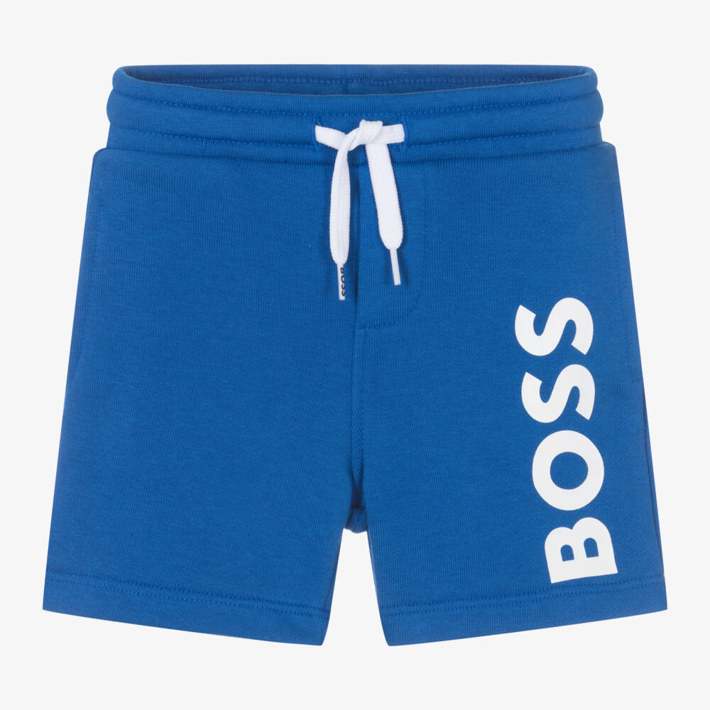 Sporty blue cotton shorts for little boys by German brand BOSS, with a bold white logo printed on one leg. Made in comfortable sweatshirt jersey, they have a drawstring waistband for a good fit and useful, concealed side pockets.