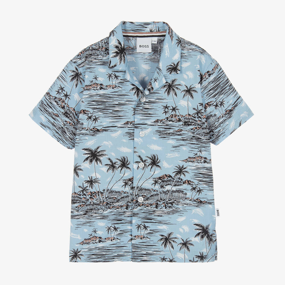 A blue shirt for boys by BOSS, patterned in a tropical palm tree design. Made in soft cotton poplin, this top has a cool revere collar, with the BOSS logo printed throughout for a relaxed summer vibe. To complete the look, it fastens neatly with logo-embossed buttons.