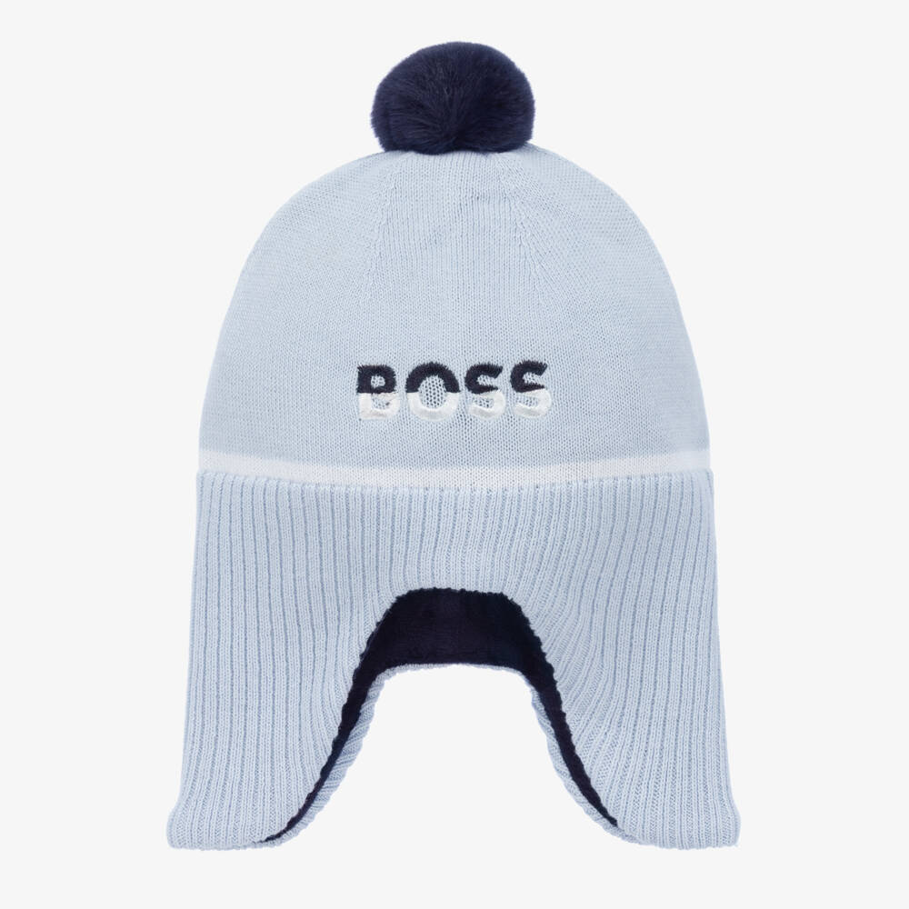 Pale blue hat for little boys by BOSS. Finely knitted in soft cotton, it is lined in super soft plush velour to help keep little ones warm on chilly days. It has white stripe detailing and an embroidered logo in navy blue and white. There are knitted ribbed ear flaps for extra warmth and a cute navy blue pom-pom on the top.