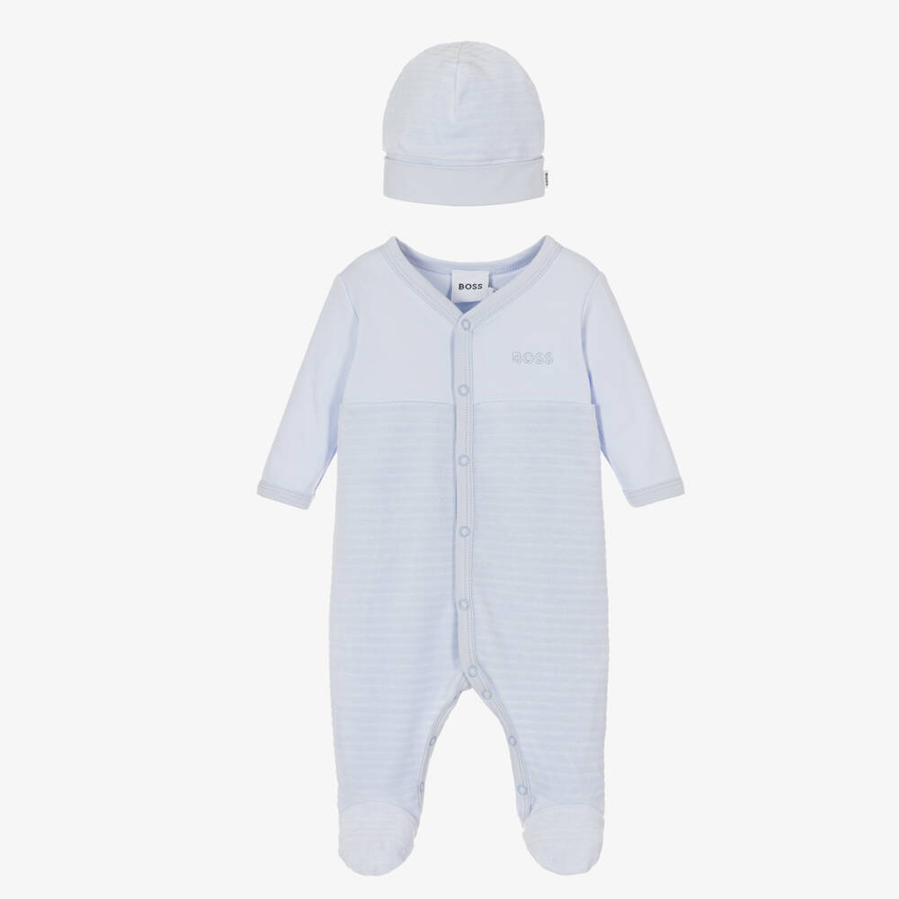 Lovely pale blue velour babygrow and hat set for boys by BOSS, made in soft organic cotton. Gently textured in a soft rib, it has the brand's iconic logo embroidered on the chest. This sweet one-piece fastens with poppers on the front and between the legs for easy dressing. For a complete look, it comes with a cute double layered hat, ideal for keeping little heads warm.