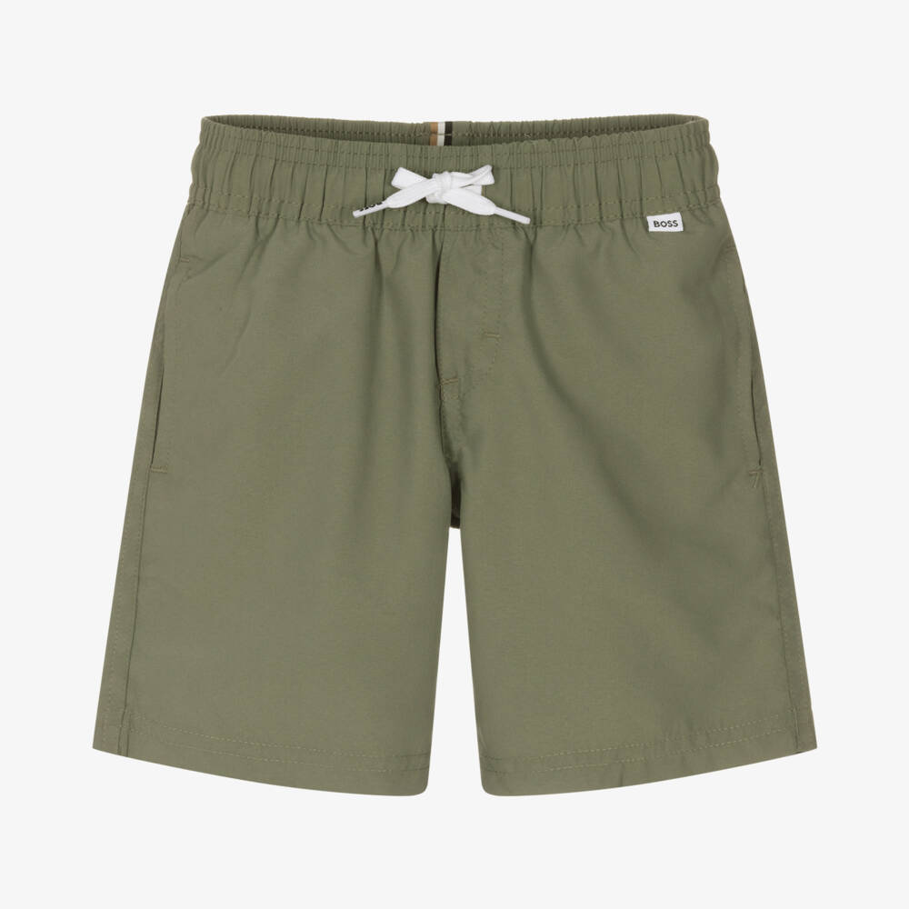 Green swim shorts for boys by BOSS. Silky smooth, they have a comfortable mesh lining, concealed side seam pockets and a drawstring waist for an adjustable fit. These fun shorts have an all-over monogram logo pattern that appears when wet. They have a small black and white logo tab on the front and a signature striped tab on the back of the waistband for discreet designer finishing touches.