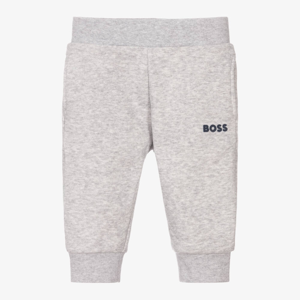 Casual light grey marl joggers for little boys by BOSS. Made in soft cotton jersey for all-day comfort, these cuffed joggers have a navy blue rubberised logo on one leg. There is an elasticated waistband, with useful pockets on the side seams.