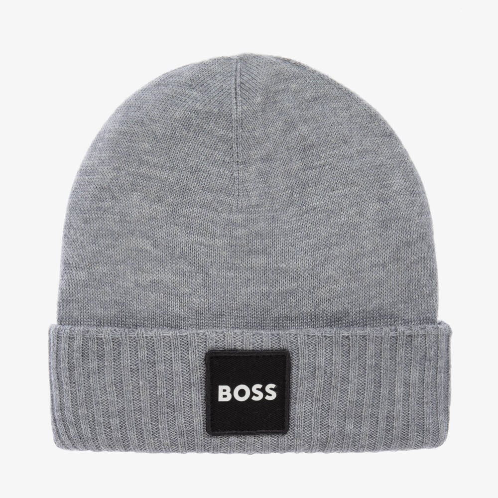 Grey beanie hat for boys by BOSS, made in a softly knitted double layer with a touch of wool for extra warmth. This cosy hat has a ribbed, turned-up brim and a black patch on the front with a white rubberised logo.