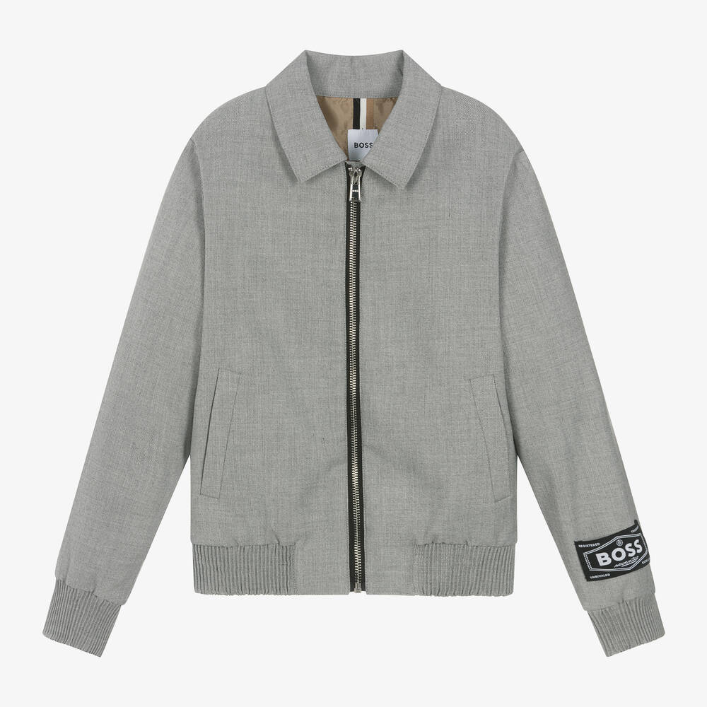 A grey mini-me jacket with pockets for boys by BOSS, made in a soft viscose blend. A cool mix of classic and contemporary, this jacket is styled with a pointed collar, branded front zip, and ribbed, elasticated trims. The Original BOSS 1977 logo label is stitched above one cuff in black and white, adding extra brand appeal. It has a silky lining in the iconic beige, white and black colourway for that subtle designer detail.