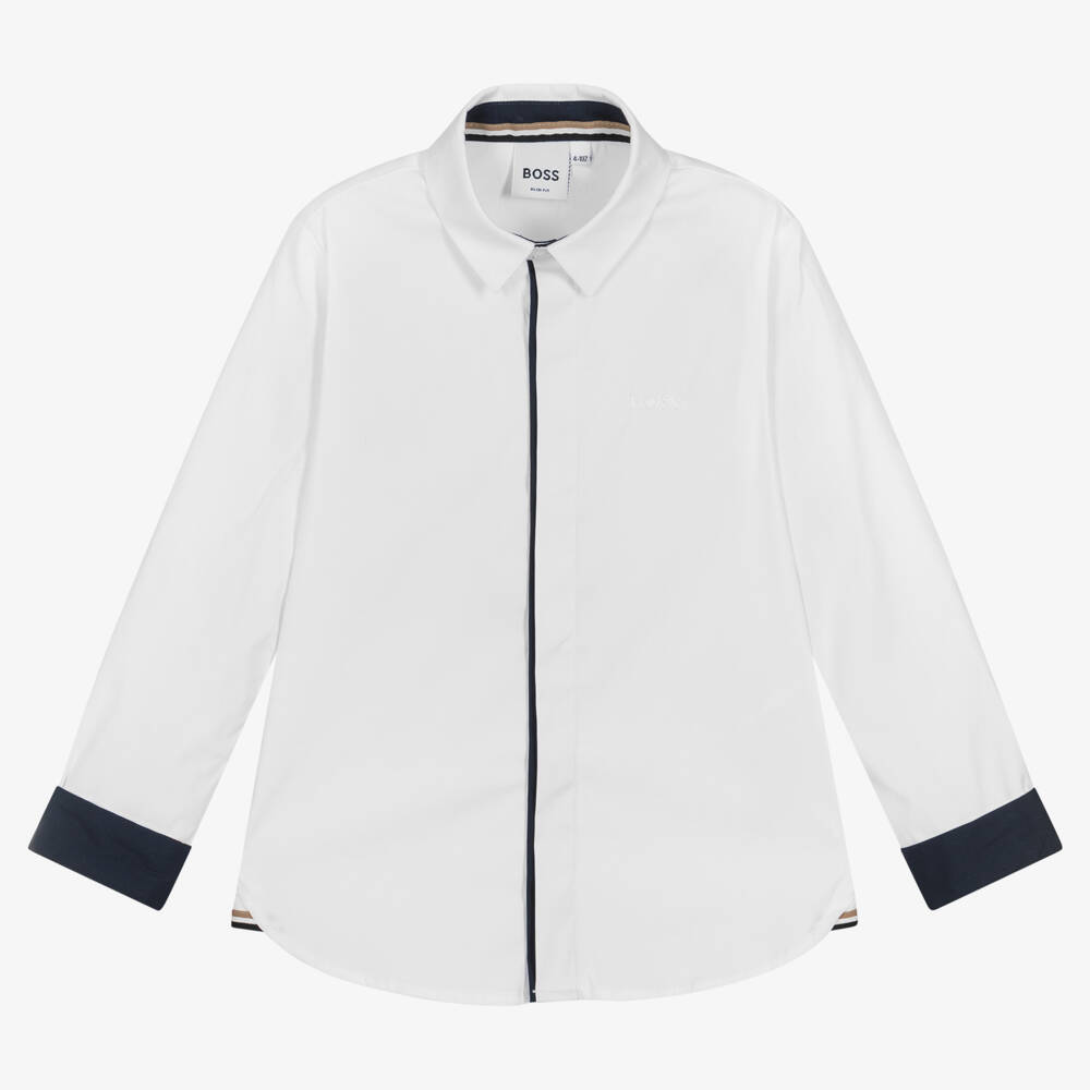 A classic white shirt for boys by BOSS, made in soft and breathable cotton poplin. This smart shirt has a tonal logo embroidered on the chest, with the brand's signature detailing on the sides. The button fastenings are neatly concealed with a navy blue placket for a more modern look.