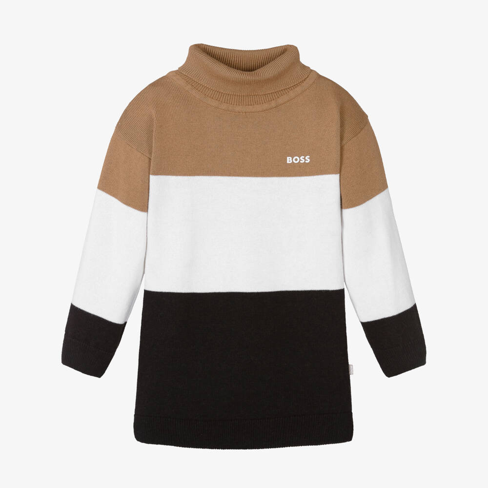 A casual beige dress for girls by BOSS, knitted in the softest cotton and wool blend. This distinctive roll-neck style has a striped design, featuring the brand's signature tricolour for a bold streetwear look. A white BOSS logo is printed on the chest and a glittery tab details the side.