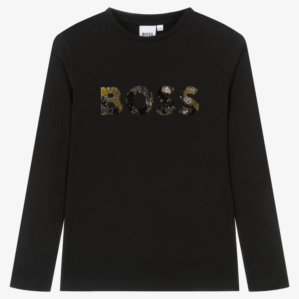 Mini-me black cotton top for teen boys by BOSS, with a camouflage-inspired, flocked logo print on the front. As seen in the adult collection, this distinctive piece has a lightly ribbed crew neck and long sleeves, making it an ideal choice for casual wear.