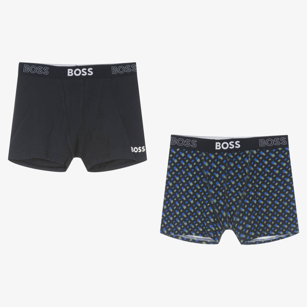 A two-pack of boxer shorts for teen boys by BOSS, made from soft and stretchy cotton jersey for ultimate comfort. One pair comes in a dark navy blue with a white logo print on one leg. The other is designed in the brand's distinctive all-over navy blue monogram logo pattern. Both styles feature the brand name woven into the elasticated waistband for a signature finish.