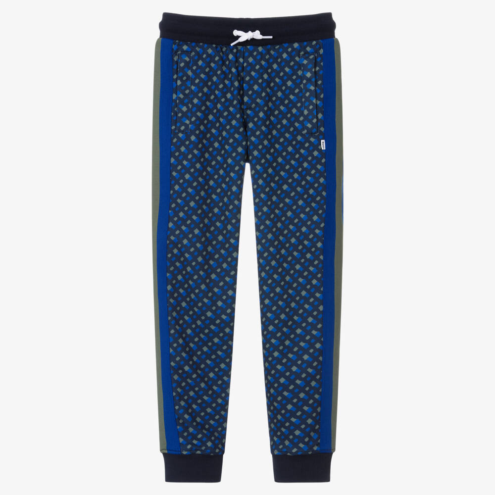 A pair of statement blue joggers for teen boys by BOSS, designed in an all-over monogram print for high-impact style. Soft and silky, they are finished with royal blue and khaki green stripes on the legs for a sporty vibe. Cut for a regular fit, they have a comfortable drawstring waist and zip pockets on the front for carrying valuables securely.