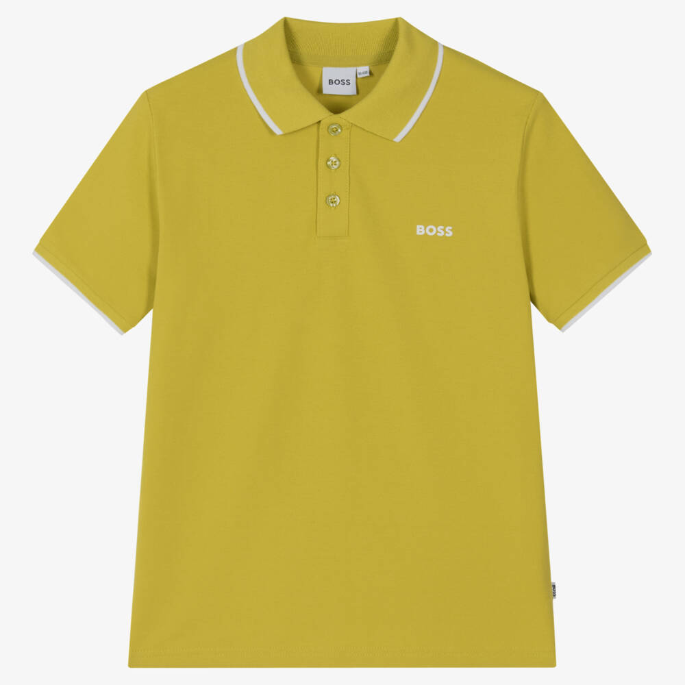 Lime green polo shirt for teen boys by BOSS, with a white rubber logo on the chest and coordinating white striped trims. Made in soft cotton piqué, this casual style has a collared neckline and fastens with branded buttons on the front placket. A small logo tab can be seen on the side seam adding further designer detail.
