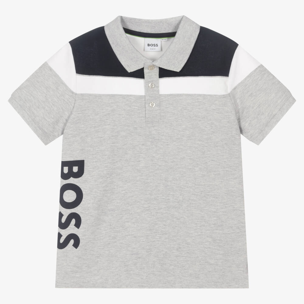 Sporty grey polo shirt for teen boys by BOSS, made from soft cotton piqué. This colour block design has white and navy blue panels with a large blue logo print down one side.