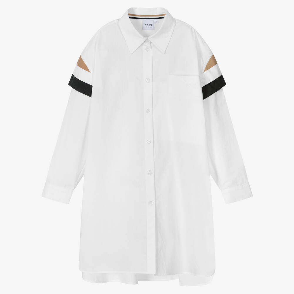 A stylish white shirt dress for teen girls by BOSS, with layered-look sleeves in a signature stripe. Designed for a relaxed fit, it has subtle logo embroidery on the front pocket and branded buttons on the front. Made in soft cotton poplin, it has a curved hem, a gathered back, and side seam vents for a casual look.
