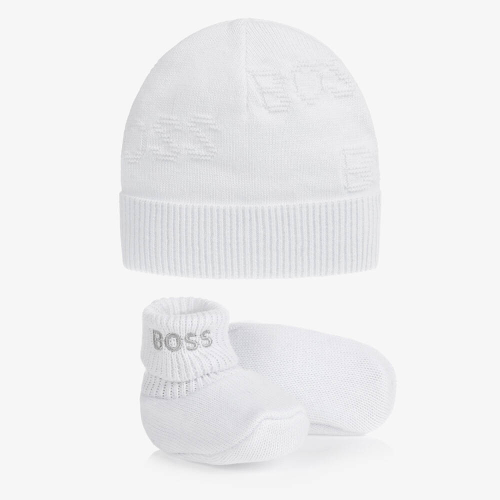 White knitted hat and booties set for baby boys and girls, designed by BOSS. Luxuriously made in soft cotton, the layette hat has a knitted logo design all-over. The adorable matching booties have grey logo embroidery on the front. This lovely set is presented in a branded box, making it ideal as a gift for a special little one.