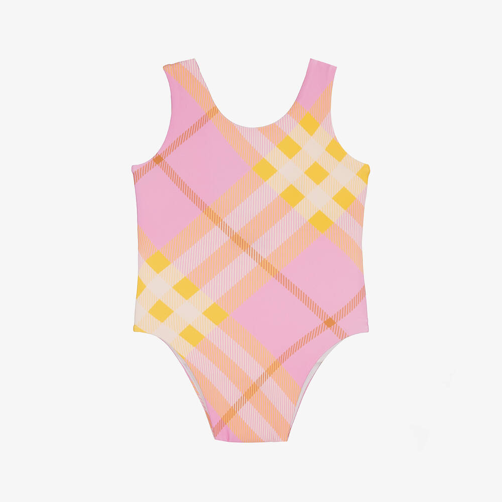 Patterned in a lovely pink and yellow check, this swimsuit for baby girls is by luxury British brand, Burberry. A bright and colourful look for the pool or the seaside, this low-back style is made from a soft and stretchy material with a lightweight lining and narrow straps. The main material of this product is made with at least 50% recycled content.