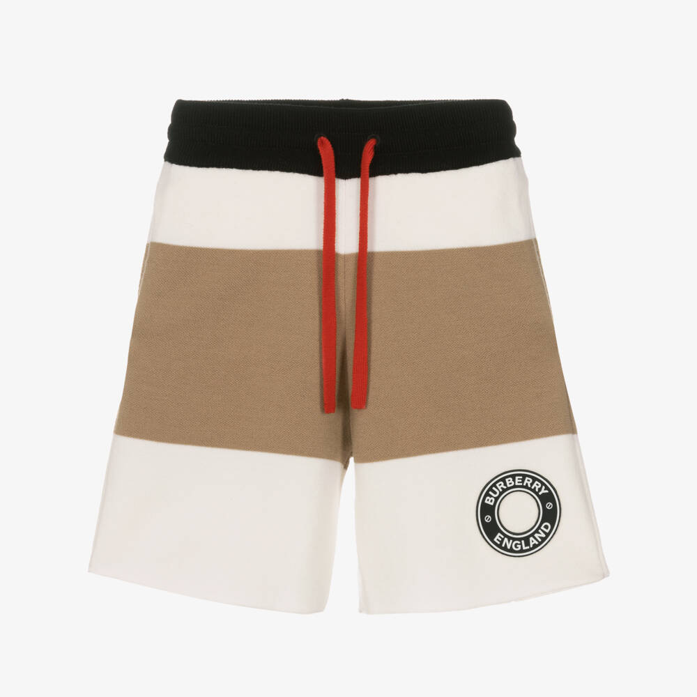 Luxurious shorts for boys by British label Burberry, styled in the designer's classic beige, ivory and black Icon Stripe. Finely knitted in cosy Merino wool, they have a rubberised black and white logo patch on one leg. The waistband has an adjustable drawstring tie for comfort and there are useful concealed side pockets.