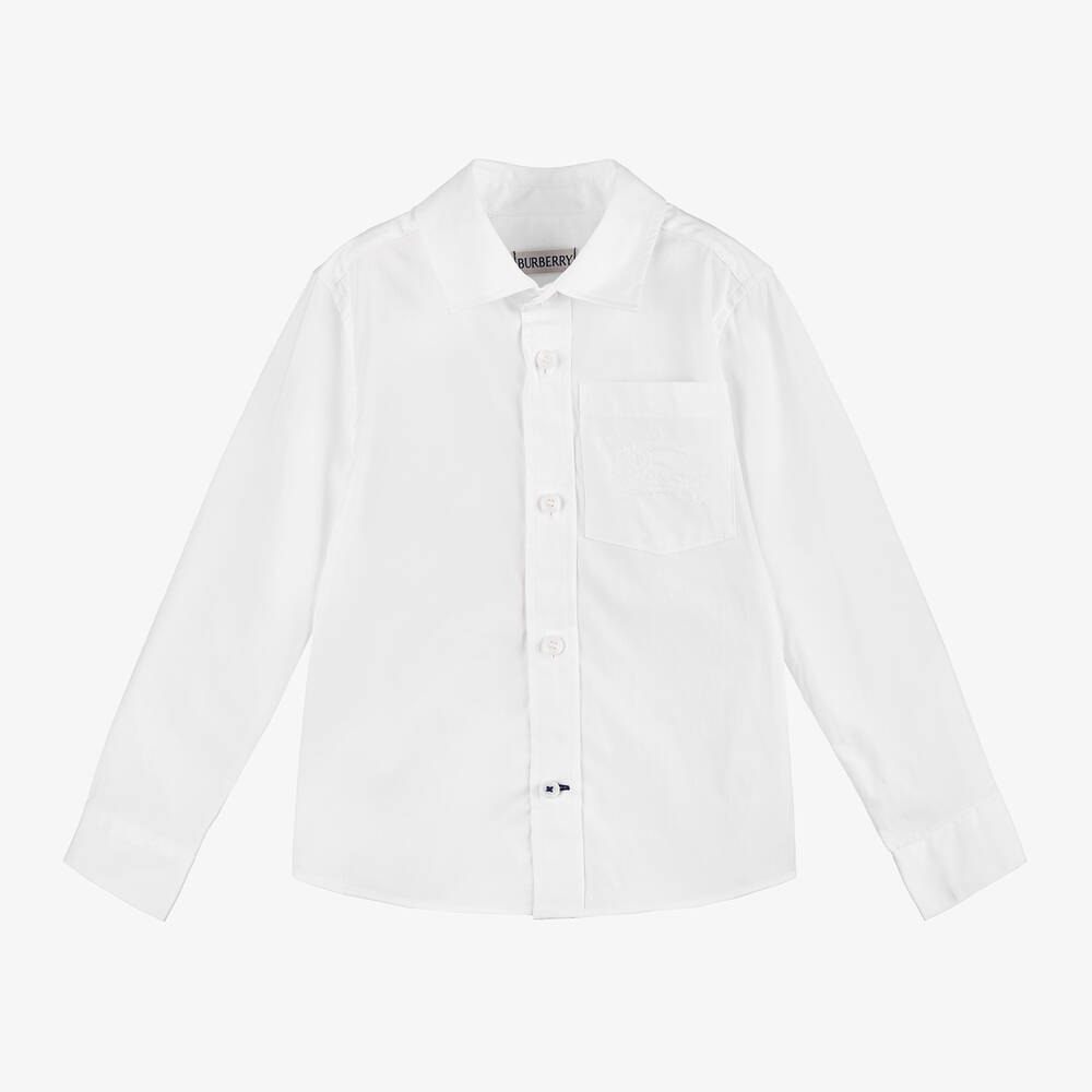A white cotton shirt for boys from iconic fashion house Burberry, styled with a pointed collar and front button. Smart and minimalistic, this long-sleeved shirt is signed with tonal EKD logo embroidery on the patch pocket. The designer's signature shade, Knight Blue, can be found threaded through the lower button. In sleek and lightweight poplin for comfort, this garment contains organic cotton.