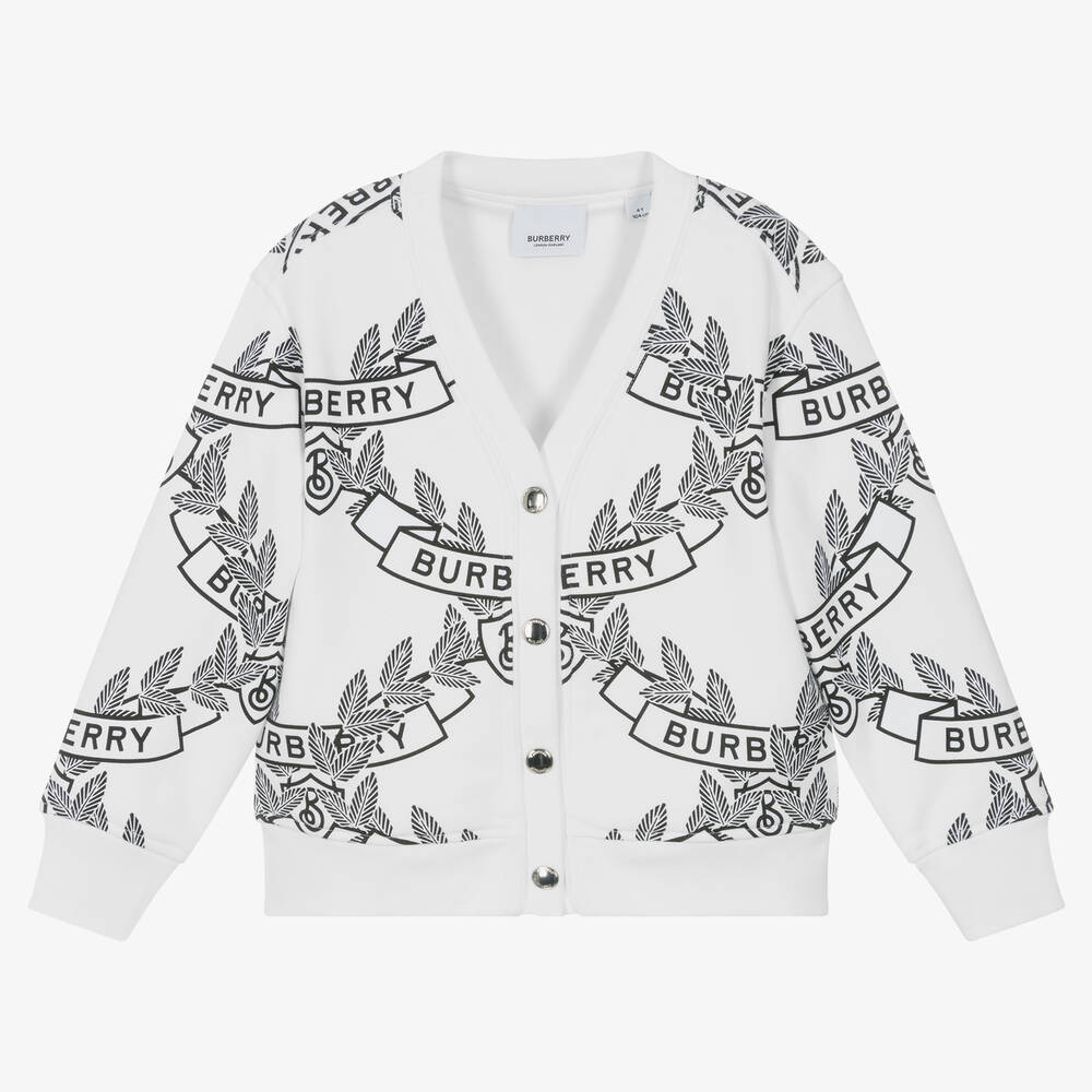 A white cotton cardigan for girls from luxury fashion house Burberry, made in soft, double-layer jersey for cosy comfort. Signed with branding, the fabric is patterned with the label's oak leaf crest and logo lettering in statement black print. It fastens with branded silver-tone poppers on the front for dressing made simple. This item contains organic cotton.