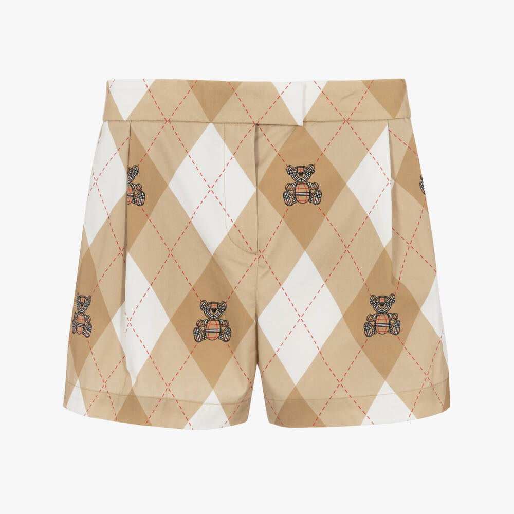 In a beige argyle check print, these cotton shorts for teen girls are from luxury British designer Burberry. For an unmistakable designer look, they feature the brand's iconic Thomas Bear motifs. Designed in a cool, wide-leg style, they fasten at the front with a zip and have an internal button and hook closure for a neat finish. For a comfortable fit, the back is elasticated and they have useful, concealed side seam pockets.