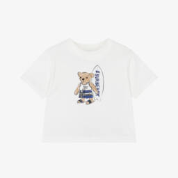 White cotton T-shirt for baby boys and girls from luxury British brand Burberry. Instantly recognisable, it has the designer's Vintage check panel across the front and contrast black lettering on the back. It fastens easily with buttons on one shoulder, for fuss-free dressing.