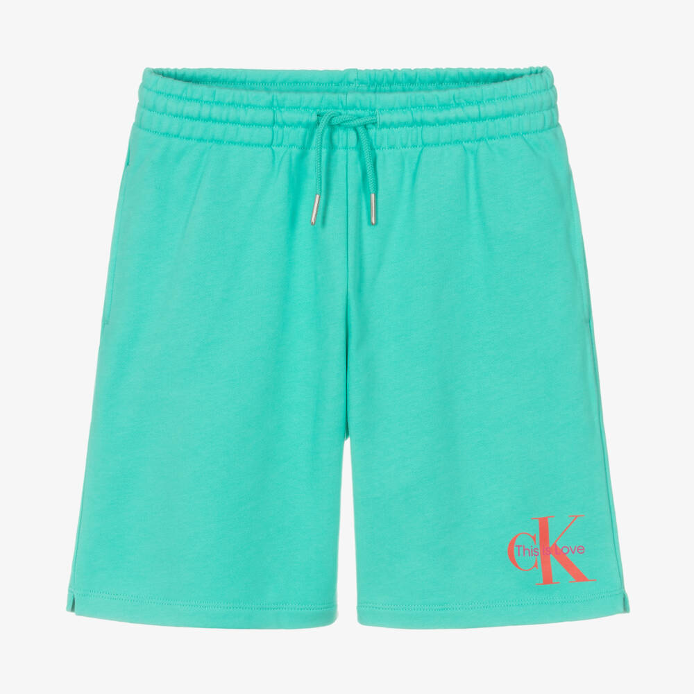 Aqua green Bermuda-length jersey shorts for boys and girls by Calvin Klein, made in soft, stretchy and medium-weight cotton. From the brand's 'This is Love' capsule, they have a red and pink Calvin Klein Monogram logo print on one leg and useful side pockets. Super comfortable, the elasticated waist is adjustable with branded drawstrings for an extra designer detail.