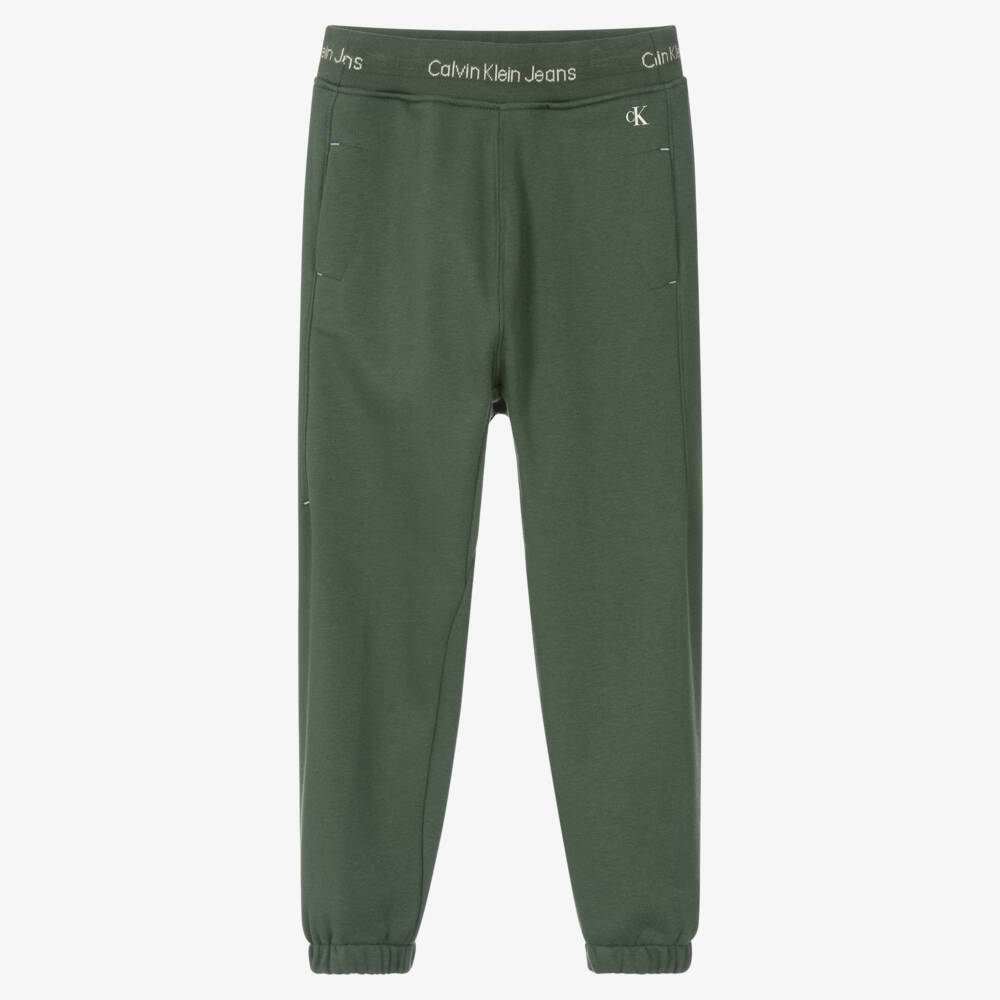 Green cotton joggers for boys by American brand Calvin Klein. Made in mid-weight jersey with a cosy, brushed feel inside, they have concealed front pockets. The stretchy ribbed waistband has a white repeat logo design and an internal drawstring tie, and there is a white logo print on the hip for a designer finishing touch.