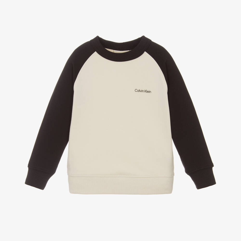 A stylish two-tone sweatshirt for boys by Calvin Klein, in dark ivory and black. Made in organic cotton jersey with raglan sleeves, it has a black rubberised logo print on the chest for instant designer appeal.