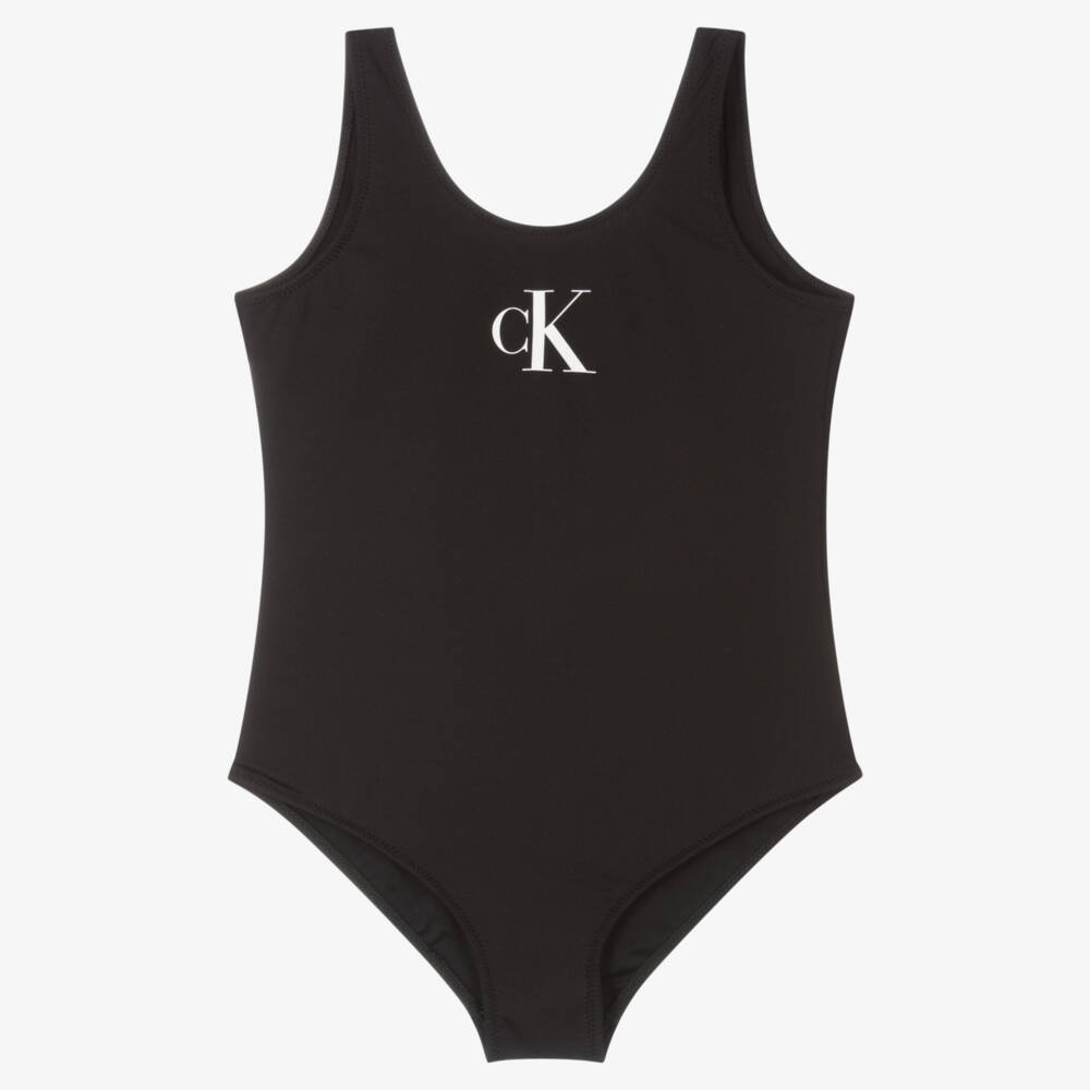 Black swimsuit for girls by Calvin Klein, with a white monogram logo print on the front. Silky soft and stretchy, this stylish one-piece is made from Repreve recycled polyester, and fully lined for comfort.