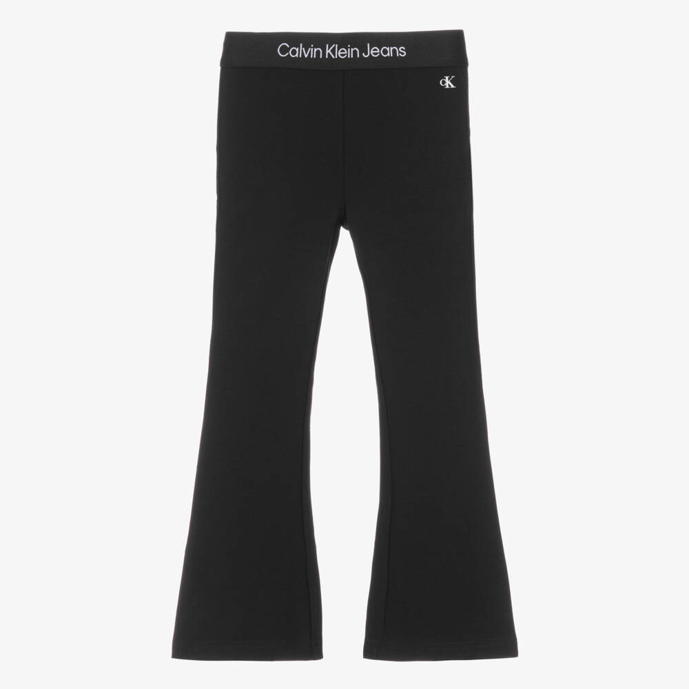 Flared black trousers for girls by American brand Calvin Klein, made in comfortable, sustainable viscose jersey. They have a stretchy, elasticated waistband, with repeat white logo embroidery and a white monogram logo printed on one side. The trousers are made with at least 50% Lensing ECOVERO.