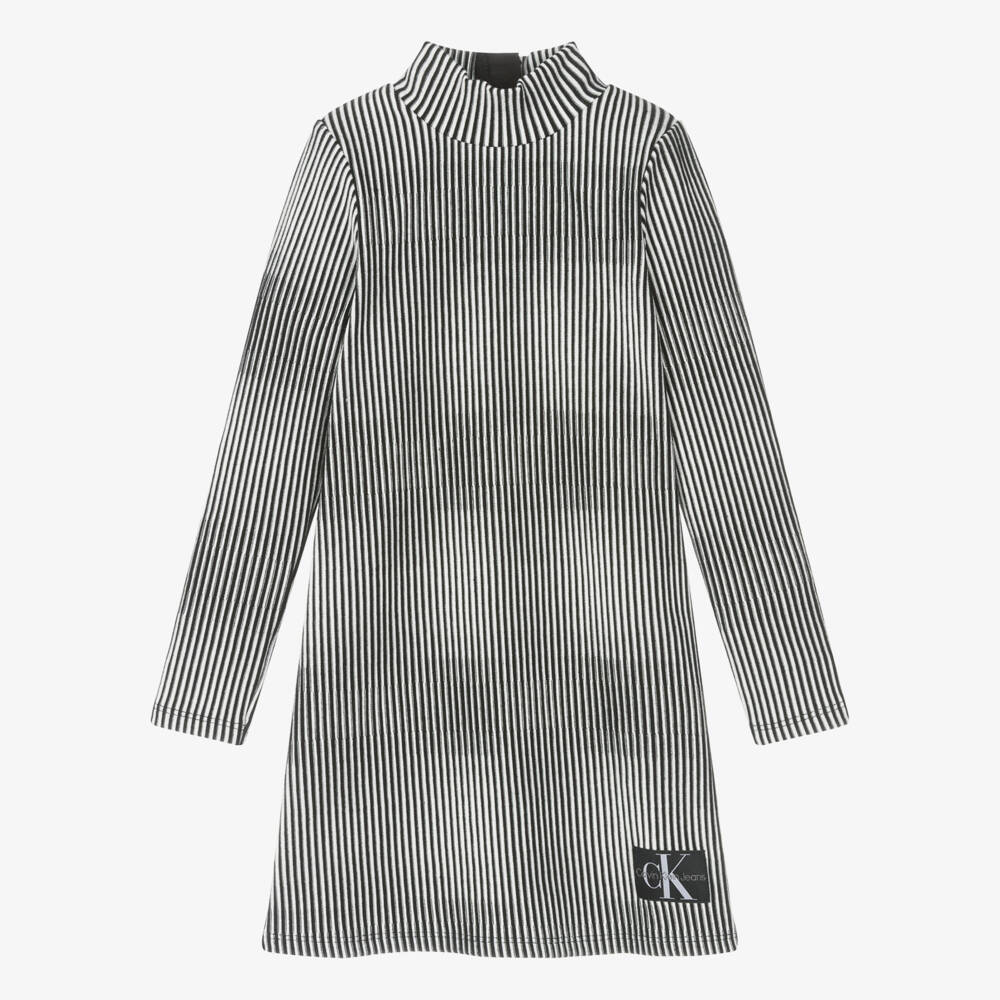 A black and white dress for girls by Calvin Klein, in a soft and stretchy viscose blend. Designed in vertical stripes, this ribbed jersey dress has a high neckline, long sleeves and a concealed zip fastening on the back. The brand's distinctive Calvin Klein Jeans logo patch can be seen on the hem.