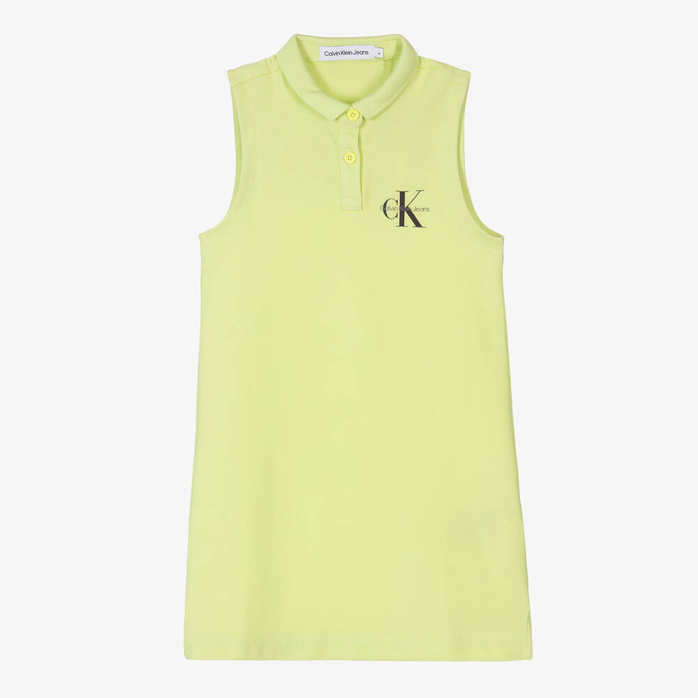 Sleeveless lime green dress for girls by Calvin Klein Jeans, made in soft cotton piqué. This casual piece has a ribbed collar and upper button fastenings. There is a CK monogram logo printed on the chest in black.